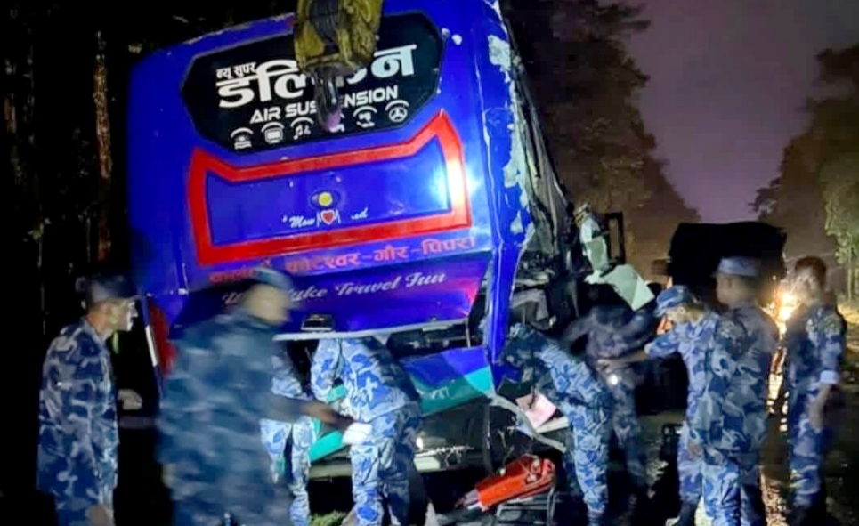 संकल्प सञ्चार – चितवनमा यात्रुवाहक बस र ट्रक आपसमा ठाेकिदा ३३ यात्रु घाईते भएका छन् । चितवनको भरतपुर महानगरपालिका–९ टिकौली जंगलमा इँटा लोड गरिएको ट्रकमा दुईवटा यात्रुवाहक बस ठोक्किदा उक्त दुर्घटना भएकाे हाे । दुर्घटना गएराति करिब पौने २ बजे भएको प्रहरीले जनाएको छ।